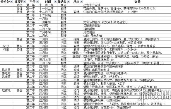 侠客风云传 情圣结局时间安排一览表;为了更好得泡妞,泡更多的妞,达成无修改无减速脚踏10条船成为大情圣,特做了一份EXCEL格式的时间战略规划,大家可以使用EXCEL的筛选功能来选择自己想要的妹子和事件,合理安排自己的闲逛事件。