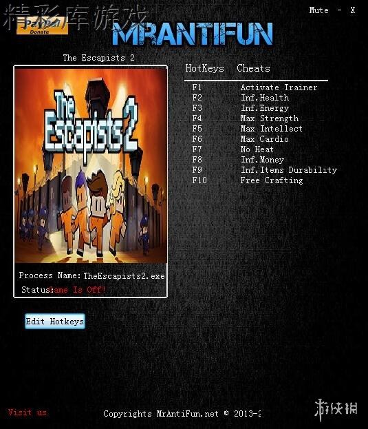 F1 - 激活修改器F2 - 无限生命F3 - 无限能量F4 - 最大力量F5 - 最大智力F6 - 最大有氧运动F7 - 不会热F8 - 无限金钱F9 - 无限道具耐久F10 - 轻松制作
