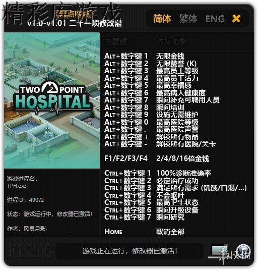 1.“无限金钱”和“无限赞誉 (K)”在数值改变或者更新数据时生效;“解锁所有物品”在解锁一个物品或者切换一下菜单后生效;“解锁所有医院/关卡 ”在进入地图时生效;“瞬间培训”在导师进入培训室时生效。