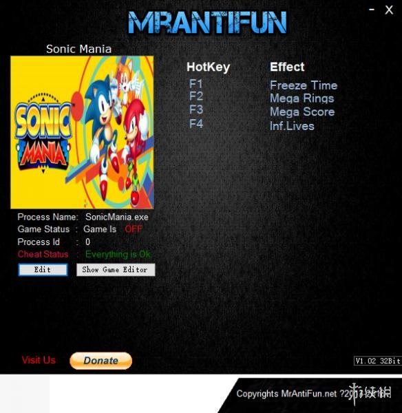F1 - 停止时间 F2 - 无限戒指F3 - 无限分数F4 - 无限生命次数