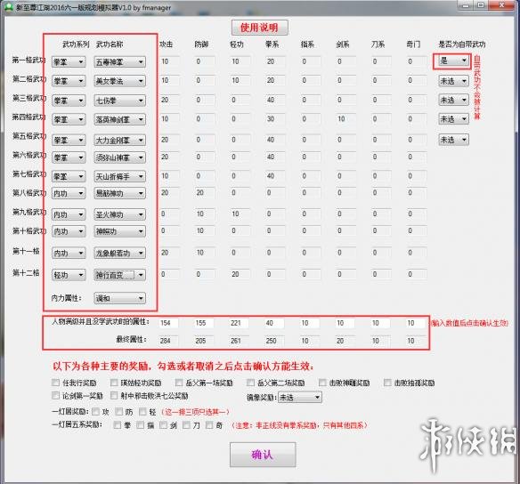 1、规划武功时,请一定按照由上往下的顺序选择每格的武功,不要跳过格子;也不要在规划好12格武功后,单独修改往上的武功。另外,如果选择了不符合系数或者内力属性的武功,该武功的数据不会被读取,请再次选择正确的武功即可;