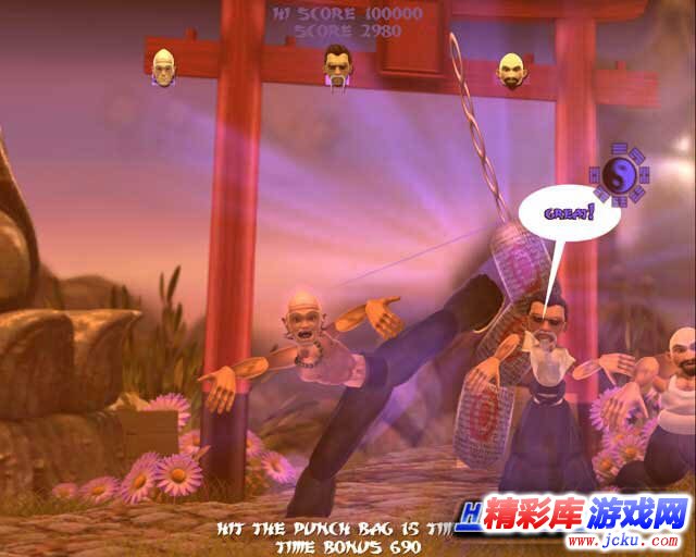 画面:游戏画面不时出现杂纹,略带昏黄的影片、加上搞笑逗趣的人物造形与夸张的武打动作,玩起来颇有看一部怀旧武打电影的感觉。不过大家别以为这样的画面一定很逊色,事实上这款游戏的画面表现非常细腻,不管是全3D的人物模块、精致的3D舞台场景,都给人赏心悦目的视觉表现。