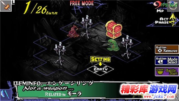 战斗前可以选择武器和KEY来放入游戏中4个角的方格里面,武器选择时会有大招展示,另注意选择武器要看好自己的职业和等级,如果选择的不是自己职业或武器等级高于人物则无法使用,游戏中分别有デュエリスト/决斗者 、ウォーリア/战士、ハーミット/刺客 、アーチャー/弓手 、プリエステス/女祭司 、ウィザード/男术士、ランスナイト/骑士这些职业,开场时会有NPC加入支援,妥善的利用会加大战斗的效率。注意战斗时我方人员是不可移动的,游戏界面中左方会显示敌人行动,上方则是攻击数、时间经验值、MP等,下方会显示生命值;