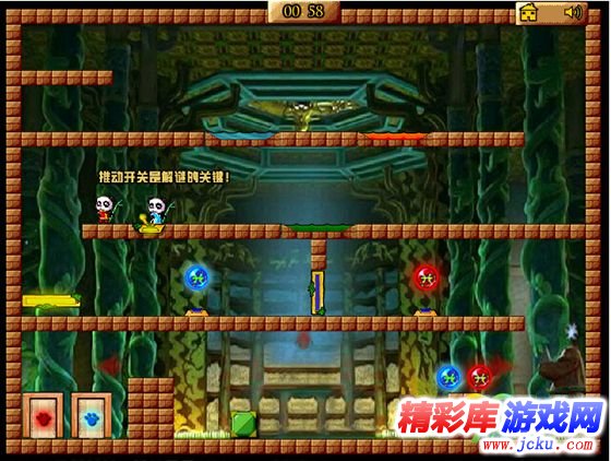 本作游戏改编自森林冰火人,替换角色为中国国宝熊猫,卡通风格以及中国元素显得更加的可爱,独具特色的关卡挑战也很有乐趣。