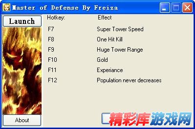 热键 作用 [F7] 塔获得超级速度 [F8] 一击必杀 [F9] 塔范围增加 [F10] 金币 [F11] 经验 [F12] 人口不会减少