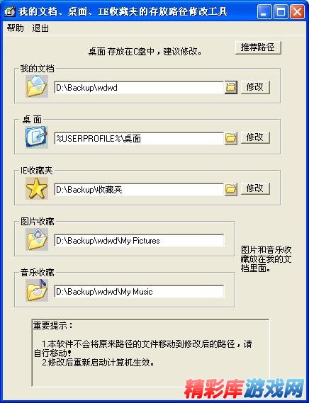 本工具用于修改我的文档、桌面、IE收藏夹的存放路径改到D盘或者其它位置,避免放在C盘导致丢失。