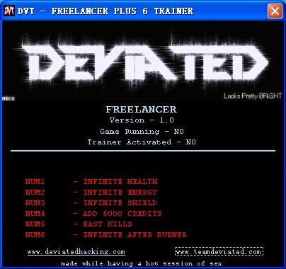F1启用修改器 NUM1 > 无限生命 NUM2 > 无限能量 NUM3 > 无限护盾 NUM4 > 加5000分 NUM5 > 容易杀死 NUM6 > 无限后燃装置