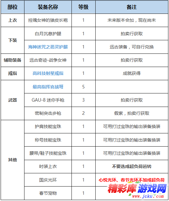 列举了一些常用的超负荷堆砌装备,获取难度较高的部分ss及拍卖较贵的装备不做列举。
