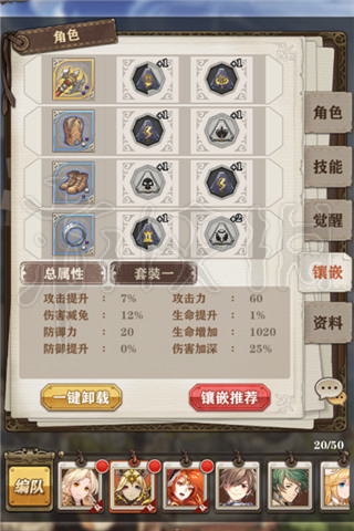 符文分成黑、白两种颜色,黑色符文的主属性为攻击,白色符文的主属性则为防御类为主。此外还会分别提供伤害加深、减免、生命提升等其他属性,各位冒险家可以根据英雄的定位装配合适的符文,如前排角色可装配防御类的白色符文。装配的方式也十分简单,每个装备上均有两个孔位可以镶嵌符文。不过需要注意的是,孔位也有黑白之分,需要对应颜色镶嵌,而双色孔位则可以任意装配符文。